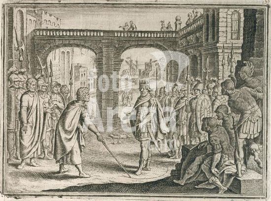 akg171147 Antiochos IV Epiphanes; King of the Seleucid Empire (175-164 BC). Antiochus and C. Popillius Laenas. (Campaign against Egypt 171-168 BC). Engraving by Matthäus Merian the Elder. (1593-1650). From: Johann Ludwig Gottfried, Historische Chronica, Frankfurt o. M. (M.Merian) 1630, p. 225. Berlin, Sammlung Archiv für Kunst und Geschichte. Museum: Berlin, Sammlung Archiv für Kunst und Geschichte.