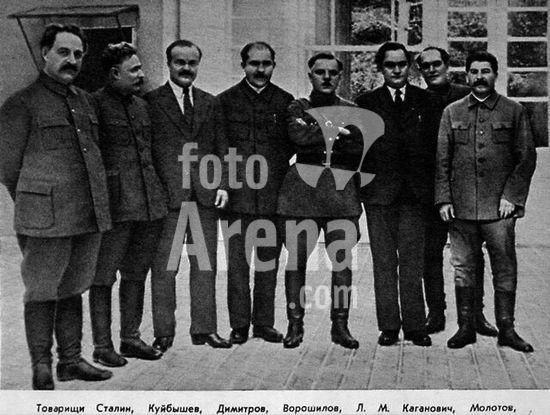 akg177016 Stalin, Joseph (orig. Iosif Vissarionovich Dzhugashvili), Soviet dictator. Gori 21.12.1879 - Moscow 5.3.1953. F. r. t. l.: Stalin, Kuibishev, Dimitrov, Vorozhilov, Kaganovitch, Molotov, Manuilski and Ordzhonikidze. Photo, March 1934.