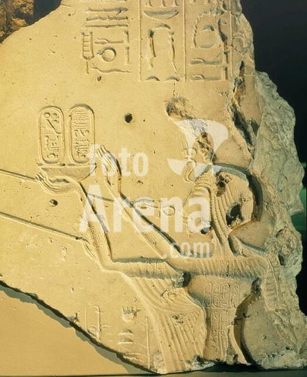 akg177207 Nefertiti; wife of the Egyptian Pharaoh Akhenaton (Amenhotep IV); New Kingdom, 18th dynasty, c. 1352-1336 BC. Nefertiti offering to sun god Aton; the divine sun ray terminates in a human hand with the symbol of life. Relief. New York, Brooklyn Museum. Museum: New York, Brooklyn Museum.