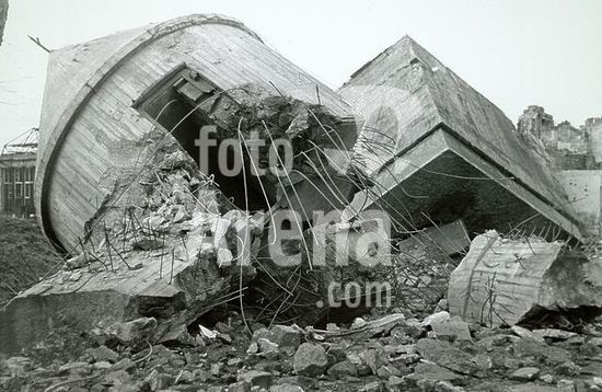 akg224268 Berlin, New Reichs Chancellory. The bunker of the war-town former Reichs Chancellory is blown up on 11 December 1947: The entrance to the bunker in the garden of the Chancellory is destroyed. Photo.