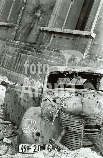 akg228332 re: Berlin-Mitte, New Reich Chancellery, Wilhelm- /. Vossstr. (built 1938 by Albert Speer). Car wreck with bullet holes (SS vehilce). Photo, 21.10.1948.