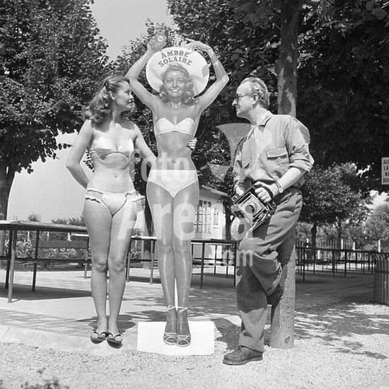 akg2375120 Lorelle, Lucien; franz. Fotograf. Paris 29.12.1894 - Megève 26.02.1968. Lucien Lorelle mit Model Suzy Bastide und lebensgroßem Werbedisplay für Ambre Solaire von L'Oréal nach einer Fotografie Lorelles. Foto, undatiert (um 1950). Privatsammlung. Museum: PRIVATE COLLECTION. Copyright: For editorial use only.