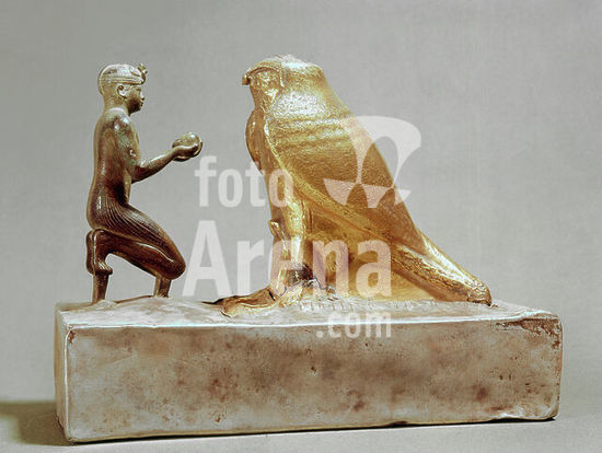 akg2437179 Taharka, (Taharqa); Egypt. King of the 25th. Dynasty (cushite); Around 690-664 BC. Statuette of King Taharka in the worship of the falcon god Hemen. Late Period, 25th dynasty, time of Taharka. Silver, wood, bronze and gold, Height 19 cm, length 26 cm. Origin: Egypt. Inv. No. E 25276, Department of Antiquities égyptiennes, Paris, Musée du Louvre. Museum: Paris, Musée Du Louvre.