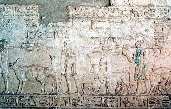akg256518 Tuna al-Jabal - Hermopolis (Upper Egypt). tomb chapel of the High Priest Petosiris in the necropolis of Hermopolis. (early Ptolemaic period, 2nd half of the 4th century BC). Cowherds. Relief from the vestibule, west wall. Painted limestone.