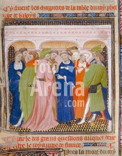 akg290019 Charles IV, the Fair, King of France. (1322-28); 1294-1328. Discuss. of the succession aft. th. death of Charles IV, last of the Capetians. Ms. illumination, French, c. 1410, workshop of the Boucicaut Master. From: Grandes Chroniques de France. Ms. Cotton Nero E.II, Vol. II., folio. 124 verso. London, British Library. Museum: London, British Library. Copyright: Additional permissions needed for non-editorial use.