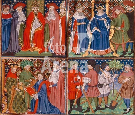 akg292826 Boccaccio, Giovanni; Italian poet and humanist; 1313-1375. Works: Opus de claris mulieribus (1374). Illustration: pope, French king, dedication (?) and depiction of a trade. Manuscr. illumination, French, 1450. From the French translation "Le livre des femmes nobles et renommées qui fit Jehan Boccace (..) ".Ms. Roy. 18 D.VII, fol. 2. London, British Library. Museum: London, British Library. Copyright: Additional permissions needed for non-editorial use.