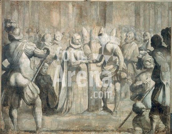 akg331795 Philip II, King of Spain (1556-98). and Portugal (fr. 1580); 1527-1598. The marriage of Philip II to the English queen Mary Tudor in Winchester, summer 1554. Grisaille painting, 1598, by Anastasio Fontebuoni (c. 1580 - 1626). Oil on canvas, 214 × 267 cm. Inv. No. 7837 (Depot). Florence, Galleria degli Uffizi. Museum: Florenz, Galleria degli Uffizi.