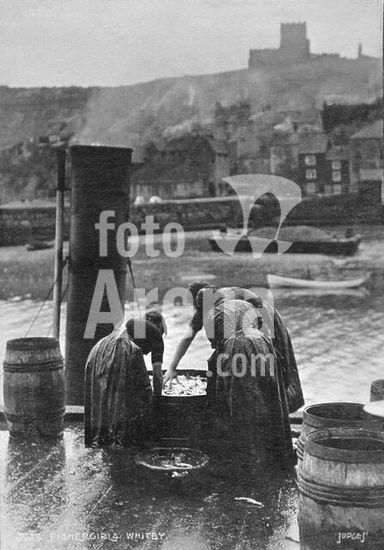 akg361508 Fishing. "Fishergirls, Whitby". Photograph, c. 1910 (Judges Ltd.). From a private photo album. Archie Miles Collection. Berlin, Sammlung Archiv für Kunst und Geschichte. Museum: Berlin, Sammlung Archiv für Kunst und Geschichte.