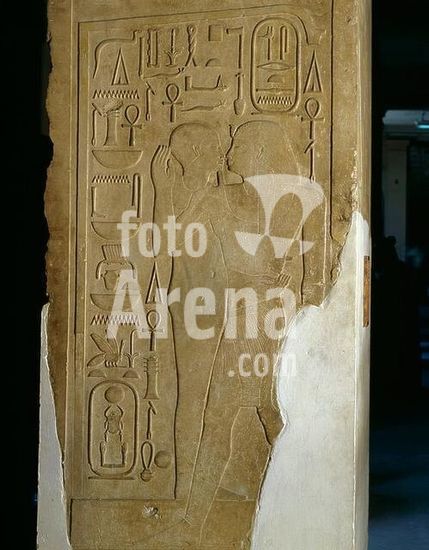 akg362062 Sesostris I, Egyptian Pharaoh of the. 12th dynasty, 1971 - c. 1929 BC. Sesostris I embracing God Ptah. Relief on one side of the "Pillar of Sesostris I". Limestone, 434 × 95cm. From the White Chapel at the Temple of Sesostris I in Karnak. Cairo, Egyptian Museum. Museum: Cairo, Egyptian Museum.