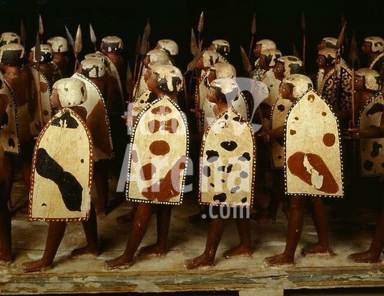 akg362118 Egyptian, Middle Kingdom, 11th dynasty, c. 2000 BC. Unit of Egyptian soldiers (40 men in ten rows) with lances and shields; partial view. Wood, painted, length 169.8cm, width. 62cm, height 5.9cm. From the Tomb of Mesehti in Asyut. JE 30986 (CG 258). Cairo, Egyptian Museum. Museum: Cairo, Egyptian Museum.