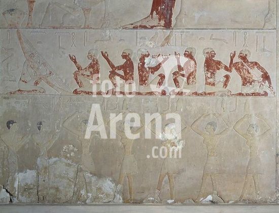 akg362218 Egyptian, Old Kingdom, 5th dynasty, c. 2400 BC. Group of musicians and dancing young girls. Relief (detail). Limestone, painted, width 111.5cm. Found at: Saqqara, Tomb of Nenkhefetka. (D. 47). Inv. no. JE 28504 (CG 1533). Cairo, Egyptian Museum. Museum: Cairo, Egyptian Museum.