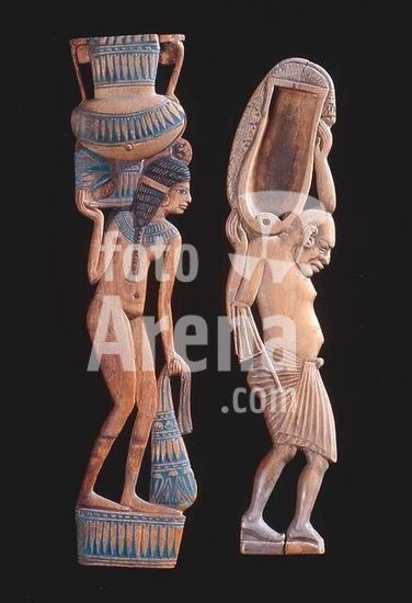 akg364323 Cosmetics. Cosmetics spoon with moveable lid in the shape of a woman carrying a vessel / Cosmetics spoon in the shape of a load carrier. Egyptian, New Kingdom, 18th dynasty, 16th/14th century BC. Wood, painted. E 8025bis / N 1735. Département des Antiquités Égyptiennes, Paris, Musée du Louvre. Museum: Paris, Musée Du Louvre.