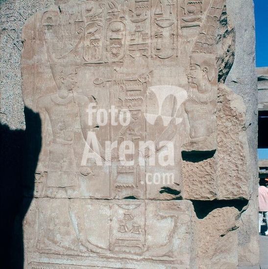 akg368898 Thutmose III, Egyptian Pharaoh; 1490 - c. 1436 BC. Pillar depicting Thutmose III before Amon Re (with feather crown). Relief, Egyptian, New Kingdom, 18th dynasty, c. 1450 BC. Karnak (Upper Egypt), Temple of Amon Re, Akhmenu - Festival Temple of Thutmose III.