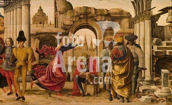 akg3841180 Ercole de' Roberti; um 1451/56 - 1496. "Der Heilige Vinzenz Ferrer errettet ein Kind aus einem brennenden Haus", 1473. Ausschnitt. (Vinzenz Ferrer; 1350-1419; spanischer Dominikanermönch, Bußprediger und Missionar). Ausschnitt aus der Predella mit den Wundern des Heiligen Vinzenz Ferrer. Predella des Polyptychons Griffoni von Francesco del Cossa. Tempera auf Holz, 29,6 x 214,6 cm. Inv. Nr. 40286. Rom, Pinacoteca Vaticana. Museum: Rome, Pinacoteca Vaticana.