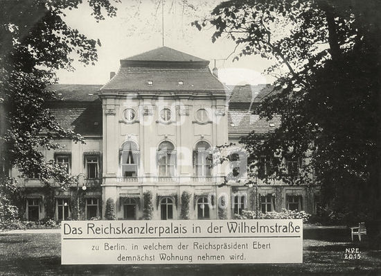 akg3862991 Berlin, Bezirk Mitte, Reichskanzlerpalais, ehemals Palais Radziwill (erbaut 1738/39 für Antoni Henryk Radziwill; Arch.: Carl Friedrich Richter; 1875-78 Umbau als Wohn- und Amtssitz des Reichskanzlers). - "Das Reichskanzlerpalais in der Wilhelmstraße zu Berlin, in welchem der Reichspräsident Ebert demnächst Wohnung nehmen wird". - (Ansicht von der Gartenseite). Foto (Pressefoto mit einkopierter Beschriftung), undatiert. 1919(?). Berlin, Sammlung Archiv für Kunst und Geschichte. Museum: Berlin, Sammlung Archiv für Kunst und Geschichte.