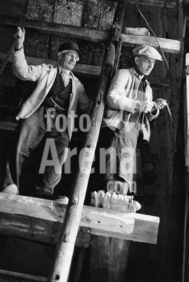 akg390140 Berlin-Mitte, Neue Reichskanzlei, Wilhelmstraße. Enttrümmerungs- und Abbrucharbeiten an der kriegsbeschädigten Reichskanzlei: Arbeiter auf einem Baugerüst. Foto, undat. (um 1948?). Copyright: For editorial use only.
