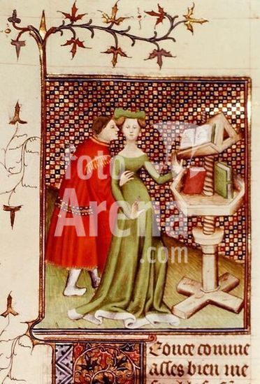 akg468920 Leontion, Athenian Hetaera and philosopher, c. 300 - 250 B.C. Leontion between a lover and studies. Illumination, French, early 15th century. From: Giovanni Boccaccio, Le livre des femmes nobles et renommées (French translation of Opus de claris mulieribus). Ms. Royal 20 C.V, f. 96 v, London, British Library. Museum: London, British Library. Copyright: Additional permissions needed for non-editorial use.