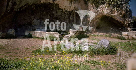 akg5198412 The Sanctuary of Pluto (Hades), who abducted Persephone. It west of the Lesser Propylaea. The cavern a shrine the entrance to the underworld. Here we will find the road to the underworld.IN THE PHOTO: Area of the caves of the Plutnion,.