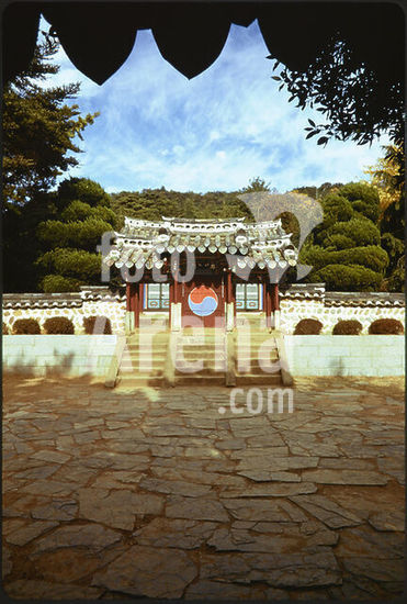 akg5275005 Tongyeong (1955-1994 Ch'ungmu; Provinz Gyeongsangnam-do, Südkorea), Chungnyeol-Schrein (Schrein zu Ehren des Admirals Yi Sun-sin; errichtet 1696). - Ansicht. - Foto, undatiert (1973 oder 1980).