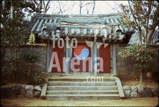 akg5275006 Tongyeong (1955-1994 Ch'ungmu; Provinz Gyeongsangnam-do, Südkorea), Chungnyeol-Schrein (Schrein zu Ehren des Admirals Yi Sun-sin; errichtet 1696). - Teilansicht: Torgebäude; auf den Torflügeln das Symbol für Yin und Yang. - Foto, undatiert (1973 oder 1980).