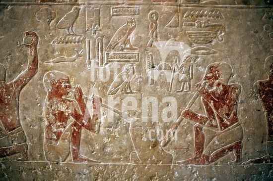 akg177183 Egyptian, Old Kingdom, 5th Dynasty, 2494-2345 B.C. Two harpists and singing women. Relief on the False Door of Nikaure from the Necropolis of Sakkara. Cairo, Egyptian Museum. Museum: Cairo, Egyptian Museum.