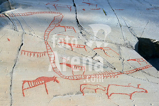 akg5739396 Norwegen, Finnmark; Stadt Alta, Alta Museum (UNESCO-Welterbe), Felsplattenfeld 6 und 7: Treibjagd auf wilde Rentiere mit Umzäunung (ca. 5000 - 4000 v. Chr.). Die Darstellung dieser Form der Treibjagd mit Eisenbahnschienen ähnelnden Zäunen gilt als älteste der Welt. Die Rentiere werden durch eine Öffnung hierher getrieben. Die Jagd fand im Herbst statt und war höchst erfolgreich. Auf dem Felsritzungsfeld 6 und 7 befinden sich 590 Figuren, die 6000 bis 7000 Jahre alt sind. Sie repräsentieren Rentier, Bär, Elch, Wal, Hund/Wolf, Mensch, Einzäunung zur Jagd; Bärenhöhle; Bärenspur; Boot; Fransenfigur; Fußsohle, Objekte und sind heute in 23 bis 25 m über dem Meeresspiegel. Das Alta Museum nahe Alta bewahrt die Felszeichnungen und Felsritzungen, die ab 1950 am Alta-Fjord entdeckt wurden. Seit 1985 sind sie UNESCO-Welterbe. 1950 fand der Bauer Fredrik Falsen bei der Kartoffelernte einen Stein mit einer männlichen Figur, der als "Pippisteinen" (Pippistein) in die Geschichte einging und im Haus des Alta-Museums ausgestellt ist. Tausende weitere Funde auf Felsplatten folgten. Die Felsmalereien werden auf ein Alter von 5000 v. Chr. bis zur christlichen Zeitenwende 0 datiert und sind bis zui 7000 Jahre alt. Sie gelten als älteste Zeugnisse der Kulturgeschichte am Alta Fjord und nördlich des Polarkreis und dokumentieren zudem die Ur- und Frühgeschichte der Sami (Samen), von der Steinzeit bis in die Jetztzeit. Ausgestellt sind auch Sami-Trommel (17. Jh) oder der Nachbau eines bis zu 7000 Jahre alten Bootes aus Leder mit hölzernem Elchkopf. Zwei Wege erschließen das Open air-Gebiet, die ältesten Felsritzungen, bis 7000 Jahre alt, sind rot markiert, die jüngsten, ab 500 v. Chr. entstandenen nicht. An Platte 4, wo ein prähistorischer "Schattentanz" zur Aufführung kommt, sind Rentier, Elch, Heilbutt, Mensch und Boot abgebildet. Platte fünf zeigt die Anfänge, als sich alles um Bären drehte: Ein großer grüner Bärenkopf entstand wohl natürlich in einer Muld.