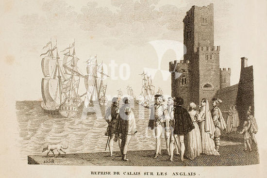 akg5822651 Spanish-French war 1556-58 / Reconquest of the city of Calais on January 8, 1558 (French commander Francis of Lorraine, Duke of Guise, conquers the city of Calais, which has been ruled by the English since 1347). - "Reprise de Calais sur les Anglais". - Copper engraving by Lecerf (Jacques Louis Constant Le Cerf ?, worked 1815-1824). From: B. Allent (Eugène-Amédée Balland), Histoire de France en Estampes, Paris (Pierre Blanchard / Lecerf graveur-éditeur) (1826). Private collection.