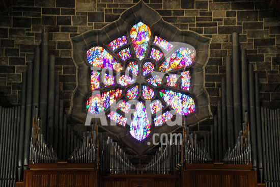 akg5836705 Ireland, Co. Galway, city of Galway: rose window in Roman Catholic Galway Cathedral (Cathedral of Our Lady Assumed into Heaven and St Nicholas), built 1958 - 1965. The monumental cathedral was built on the site of the old city prison. architect of the cathedral was John J. Robinson: He chose a renaissance style or even neo-Renaissance style, for the building.