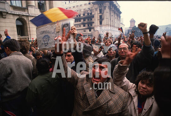 akg7286296 Romania / Romanian Revolution 1989 / 16-25 December 1989. One day after the execution of the Ceausescu couple people are in the street shouting out their anger and celebrating their victory. On a sign bars were drawn across a portrait of Nicolae Ceausescu next to the drawing of a devil and the words "criminal" and "tyrant". Photo, December 26, 1989.