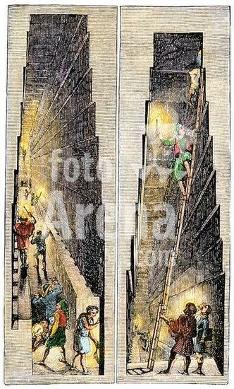 akg892363 European visitors exploring chambers inside the Great Pyramid, early 1800s. Handcolored woodcut of a 19thcentury illustration.