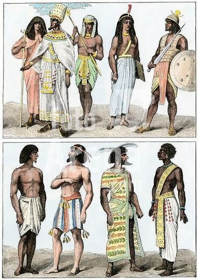 akg892378 Ancient Egyptian pharaoh with court officer and fan bearer: a judge: a guard: and neighboring tribesmen. Handcolored woodcut of a 19thcentury illustration.