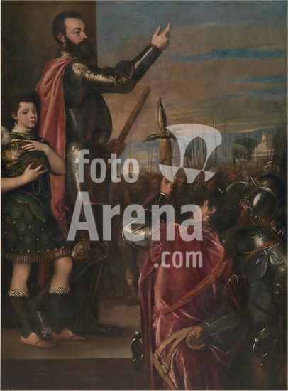 alb8909560 Mantua-Mantova (Lombardy, Italy), Palazzo Ducale, Castello S.Giorgio, Camera degli Sposi (frescos, c.1465-74, by Andrea Mantegna; 1431-1506).-Interior view looking northwest: west wall with "Meeting between Ludovico III Gonazaga and his son Francesco", north wall with "Court of Ludovico III".-Photo.