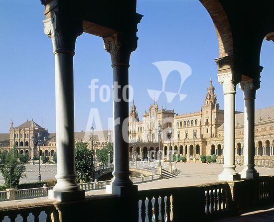 orz128498 VISTA DE LA ZONA CENTRAL DESDE DETRAS DE LOS ARCOS - FOTO AÑOS 80. Author: ANIBAL GONZALEZ ALVAREZ-OSORIO (1876-1929). Location: España Square. Sevilla. Seville. SPAIN.