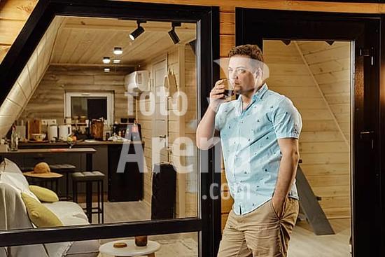 ibxaii10941185 A man enjoys juice while standing on terrace of log cabin late at night