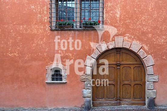 ibxann10157186 House façade with courtyard gate and barred windows, Kaltern, South Tyrol, Italy, Europe