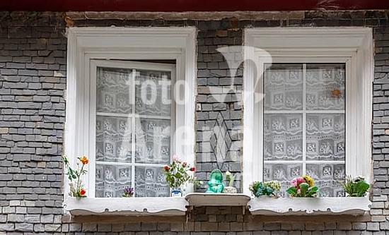 ibxann10262783 Slate-clad house facade, two windows and decoration made of artificial flowers, historic old town, Morlaix, Départements Finistere, Brittany, France, Europe