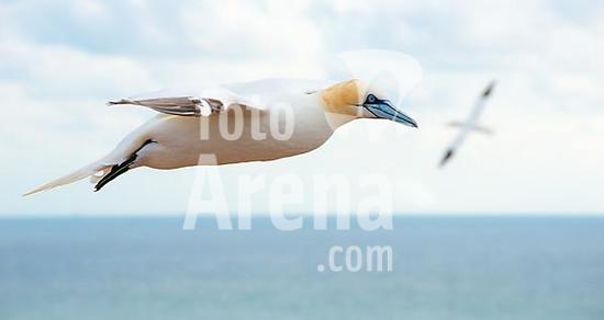 ibxcva10149428 Northern gannet (Morus bassanus or Sula bassana) flying by with outstretched wings, in the background another animal with outstretched wings, sea with wide horizon in the background, island Helgoland, North Sea, Schleswig-Holstein, Germany, Europe