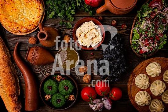 ibxgai10273646 Traditional Georgian table, top view, Khinkali, Phali, Shoti, Khachapuri, Sauces, Fruits, nuts, Salad, cheese, horizontal, no people