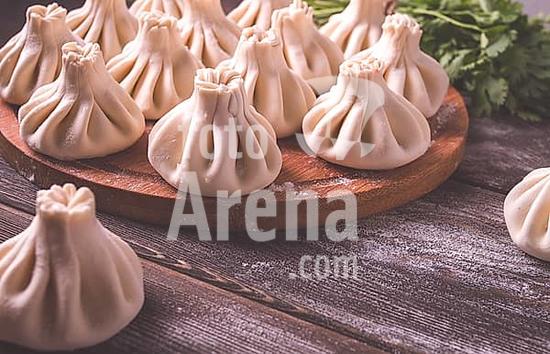 ibxgai10273763 Raw khinkali, Traditional Georgian dish, on a wooden table, selective focus, rustic, no people