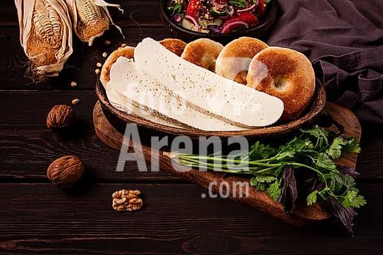 ibxgai10277651 Mchadi, corn tortillas, traditional Georgian dish, corn bread, with Imeretian cheese, homemade, no people, on a wooden table