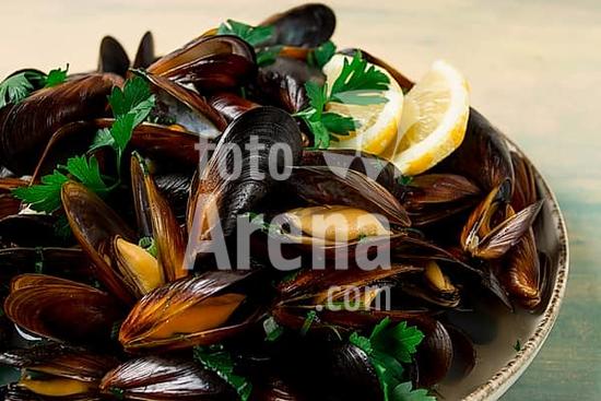 ibxgai10391546 Fresh, Boiled mussels, Black Sea, with parsley and lemon, no people