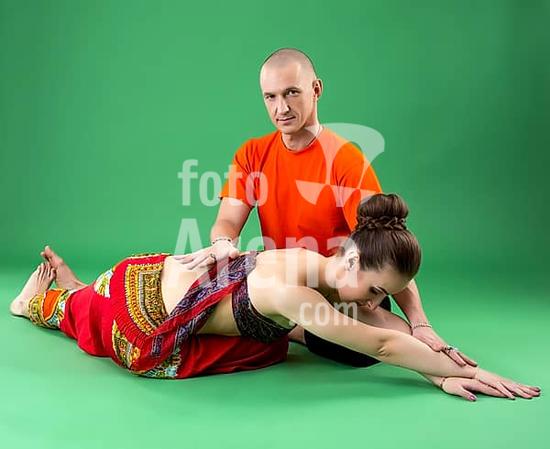 ibxgur10355915 Yoga. Studio photo of instructor helps woman to perform asana