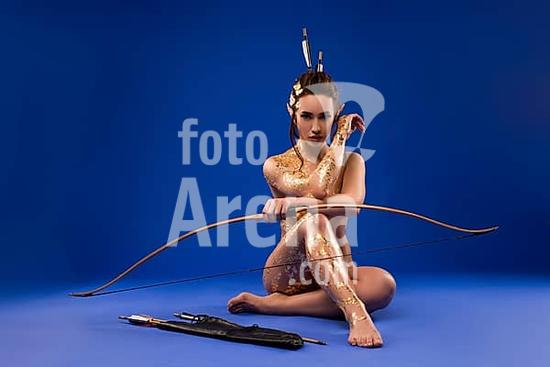 ibxgur11076068 Full length of sensual confident female model with golden paint on naked body and elf ears sitting on floor arrows and bow, blue background