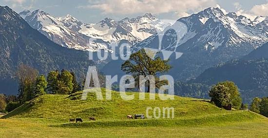 ibxhal10594145 Group of trees with cattle in spring, snow-covered mountains of the Allgäu Alps in the background, near Schöllang, Oberallgäu, Allgäu, Bavaria, Germany, Europe