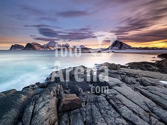 ibxheb10362593 Rocky coast, snow-capped mountains in the background, Vestvågøya, Lofoten, Norway, Europe