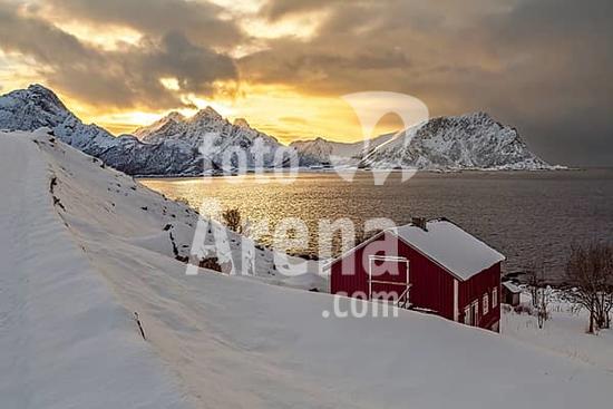 ibxhev10266482 Ein rotes Haus vor einem winterlichen Sonnenuntergang mit verschneiten Bergen auf den Vesteralen