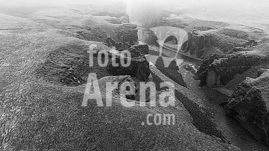 ibxkhi10361567 Fjadrarglijufur Canyon in the fog, Justin Bieber Canyon, drone image, black and white image, Sudurland, Iceland, Europe
