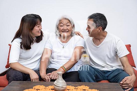ibxktg10128737 Adult children, with smiles on their faces, embrace their joyful elderly mother as she sits on a sofa. Adult children warmly embrace their elderly mother, who looks directly at the camera with a joyful smile. Japanese Family