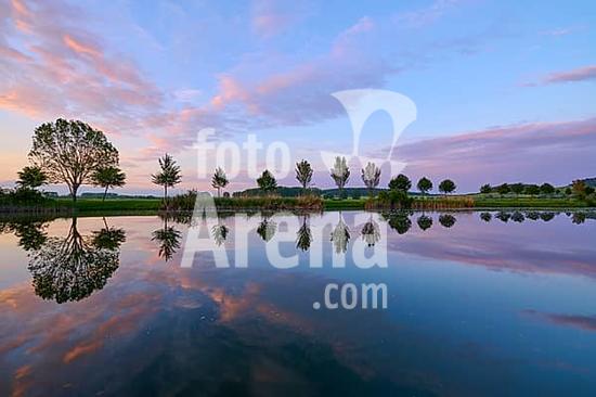 ibxlin10676603 Lake in spring with row of trees and reflection at sunset, Drei Gleichen, Ilm-Kreis, Thuringia, Germany, Europe