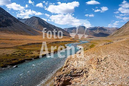 ibxmab10049096 Burkhan valley with blue river, mountain landscape with golden meadows, Terskey Ala-Too, Tien Shan, Issyk Kul province, Kyrgyzstan, Asia